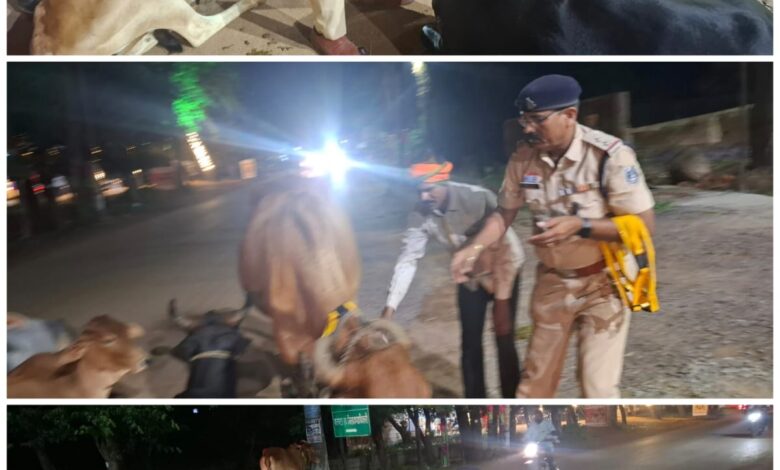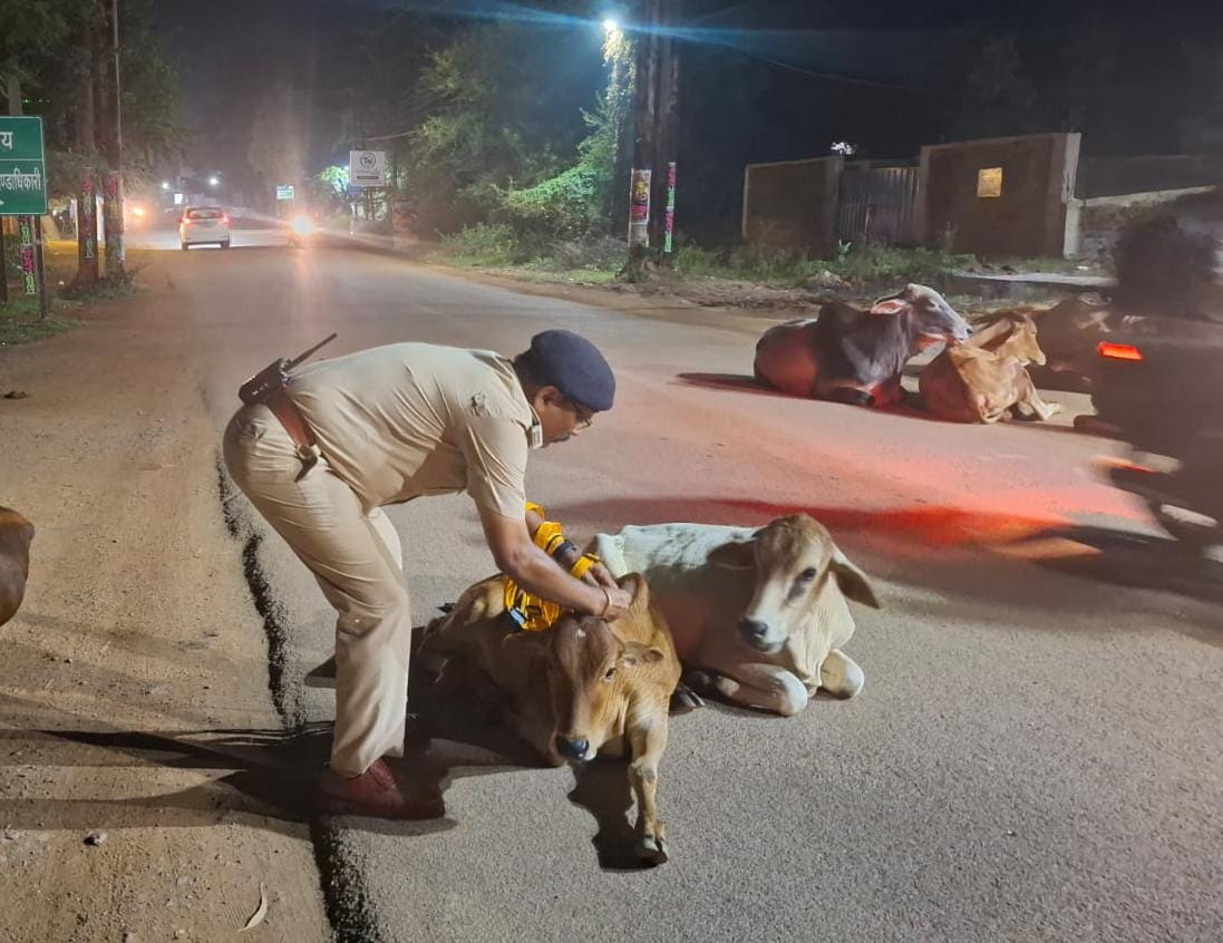 सड़क दुर्घटनाओं की रोकथाम हेतु धमतरी पुलिस की अभिनव पहल – आवारा मवेशियों को पहनाए जा रहे रेडियम रिफ्लेक्टर बेल्ट