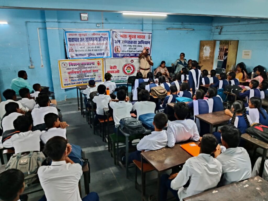 धमतरी पुलिस यातायात द्वारा यातायात जागरूकता अभियान – छात्रों को दिए सड़क सुरक्षा व नशा मुक्ति के संदेश