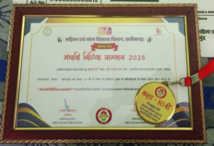 सरायपाली। आज 17 सितंबर को कृषि महाविद्यालय रायपुर के सभागृह में केंद्रीय महिला बाल विकास मंत्री श्रीमती अन्नपूर्णा देवी, छत्तीसगढ़ के मुख्यमंत्री विष्णु देव साय जी, रायपुर लोकसभा के सांसद श्री बृजमोहन अग्रवाल जी,छत्तीसगढ़ की महिला विकास मंत्री श्रीमती लक्ष्मी राजवाड़े जी, आरंग के विधायक एवं मंत्री खुशवंत शाहब जी विधायक पुरंदर मिश्रा जी और भी कई गणमान्य नागरिकों की उपस्थिति में मेधावी बिटिया सम्मान समारोह में सरायपाली की स्वामी आत्मानंद विद्यालय में अध्यनरत छात्रा कुमारी महक गर्ग पुत्री( राजेश मोनी अग्रवाल) “फर्म- जगत नारायण कैलाश चंद्र अग्रवाल” सरायपाली का कक्षा दसवीं बोर्ड परीक्षा में 97.33 प्रतिशत अंक लाने पर सम्मान किया गया।
