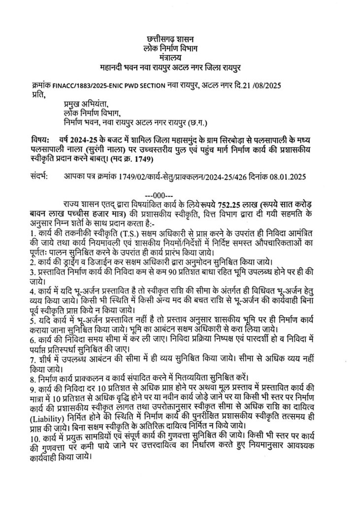 अब सिरबोड़ा–पलसापाली नाले पर उच्चस्तरीय पुल पुलिया और मार्ग निर्माण के लिए मिली 7.52 करोड़ रूपये से अधिक की स्वीकृति