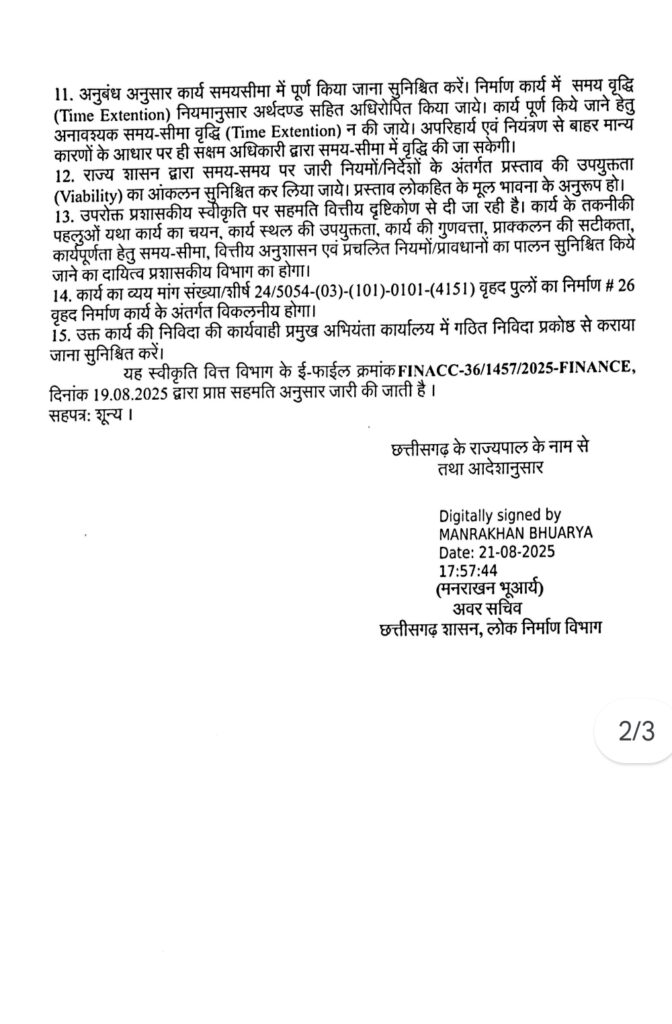 वर्षों पुरानी इस मांग को पूरा करने हेतु विधायक चातुरी नंद ने लगातार शासन और विभागीय स्तर पर अनुशंसा की। उनके अथक प्रयासों के परिणामस्वरूप अब लोक निर्माण विभाग छत्तीसगढ़ शासन द्वारा 752.25 लाख रुपये (सात करोड़ बावन लाख रुपये मात्र) की प्रशासकीय स्वीकृति प्रदान की गई है।