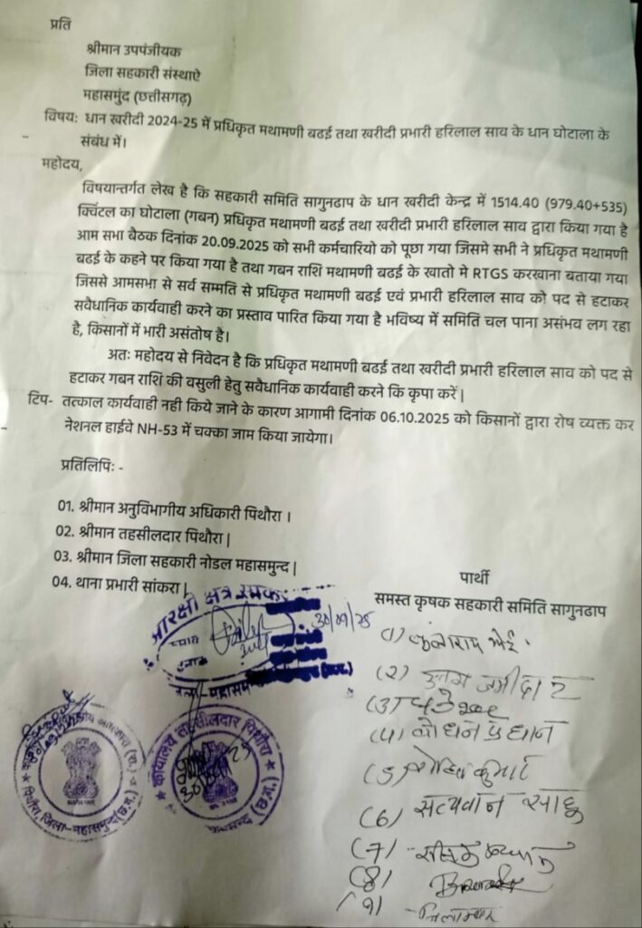 महासमुंद।जिले की सागुनढाप सहकारी समिति के धान खरीदी केंद्र में वर्ष 2024-25 की खरीदी में करीब 50 लाख रुपए का बड़ा घोटाला सामने आया है। आरोप है कि खरीदी प्रभारी मथामणि बढ़ाई और हरिलाल साव ने 1514.40 क्विंटल धान का गबन किया और राशि को समिति के अधिकृत खाते में जमा न कर निजी खातों में ट्रांसफर कर दिया।