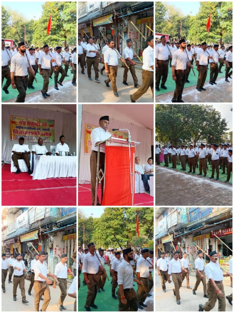 इस एक घंटे के संचलन में संघ के स्वयंसेवकों ने अनुशासन, एकता और राष्ट्रभक्ति का अद्भुत प्रदर्शन किया।पथ संचलन के मार्ग में नागरिकों ने जगह-जगह फूलों की वर्षा कर स्वयंसेवकों का स्वागत किया। राष्ट्रभक्ति के नारों से मार्ग गूंज उठे और पूरे नगर में उत्सव जैसा माहौल बना रहा। लोगों ने तालियों की गूंज और जयकारों के साथ स्वयंसेवकों का अभिनंदन किया। बच्चों, युवाओं से लेकर वरिष्ठ नागरिकों तक सभी मार्ग में उपस्थित होकर इस राष्ट्रभक्ति के आयोजन के साक्षी बने।शाम 4:30 बजे गांधी चौक मैदान में मंचीय कार्यक्रम आयोजित हुआ, जिसमें मुख्य वक्ता के रूप में राष्ट्रीय स्वयंसेवक संघ के क्षेत्रीय बौद्धिक प्रमुख मध्यप्रदेश-छत्तीसगढ़ नागेंद्र वशिष्ठ उपस्थित रहे। साथ ही अध्यक्षता प्रोफेसर ज्ञानचंद वैद्य ने की। विशिष्ट अतिथि नगर संघचालक रामलखन गजेन्द्र उपस्थित थे।श्री वशिष्ठ ने अपने प्रेरणादायक संबोधन में कहा कि संघ की ध्वजा को देखते ही एक पवित्र भावना जागृत होती है। उन्होंने बताया कि संघ में कोई व्यक्ति गुरु नहीं होता, ध्वजा ही हमारा गुरु है।श्री वशिष्ठ ने संघ के उद्देश्य पर प्रकाश डालते हुए कहा कि इसका मुख्य लक्ष्य राष्ट्र सेवा और आत्म-सम्मान की भावना को जागृत करना है। उन्होंने बताया कि डॉक्टर केशव बलिराम हेडगेवार ने 1925 में विजयदशमी के दिन इस संगठन की नींव रखी थी और आज 100 वर्षों बाद यह संगठन एक वटवृक्ष का रूप ले चुका है, जिसकी शाखाएं देश-विदेश में फैल चुकी हैं।उन्होंने आगे बताया कि डॉक्टर हेडगेवार ने संघ की नींव सात सूत्रों पर रखी थी — आत्म जागृति, अपनत्व, राष्ट्रीयता, सामूहिकता, अनामिकता, समर्पण और स्वदेशी। ये मूल्य आज भी संघ की कार्यप्रणाली की आत्मा हैं। उन्होंने कहा कि संघ को अनेक बार विरोध और उपहास का सामना करना पड़ा, लेकिन स्वयंसेवकों ने अपने पथ से कभी विचलित नहीं होकर राष्ट्र सेवा को ही अपना ध्येय बनाए रखा।मुख्य वक्ता ने युवाओं से आह्वान किया कि वे अपने जीवन में पांच परिवर्तन लाएं — परिवार में संस्कार हो, माता से सेवा और प्रेम के संस्कार सीखें, पिता से नेतृत्व की प्रेरणा लें, समाज को संगठित करें, वातावरण को शुद्ध बनाएं और अपने अधिकार एवं कर्तव्यों को समझें। उन्होंने कहा कि राष्ट्र को सर्वोपरि मानते हुए सेवा भाव के साथ आगे बढ़ना ही संघ का मार्ग है।कार्यक्रम में उपस्थित सेवानिवृत्त प्राध्यापक प्रोफेसर ज्ञानचंद वैद्य (शासकीय महाविद्यालय, धमतरी) ने कहा कि आज हम जिस स्वाभिमान युक्त वातावरण में सांस ले रहे हैं, वह अनेक महापुरुषों के बलिदान और संघर्ष का परिणाम है। उन्होंने कहा कि राष्ट्रीय स्वयंसेवक संघ ने हमेशा राष्ट्र को प्राथमिकता दी है और हर आपदा और संकट के समय स्वयंसेवक अग्रिम प