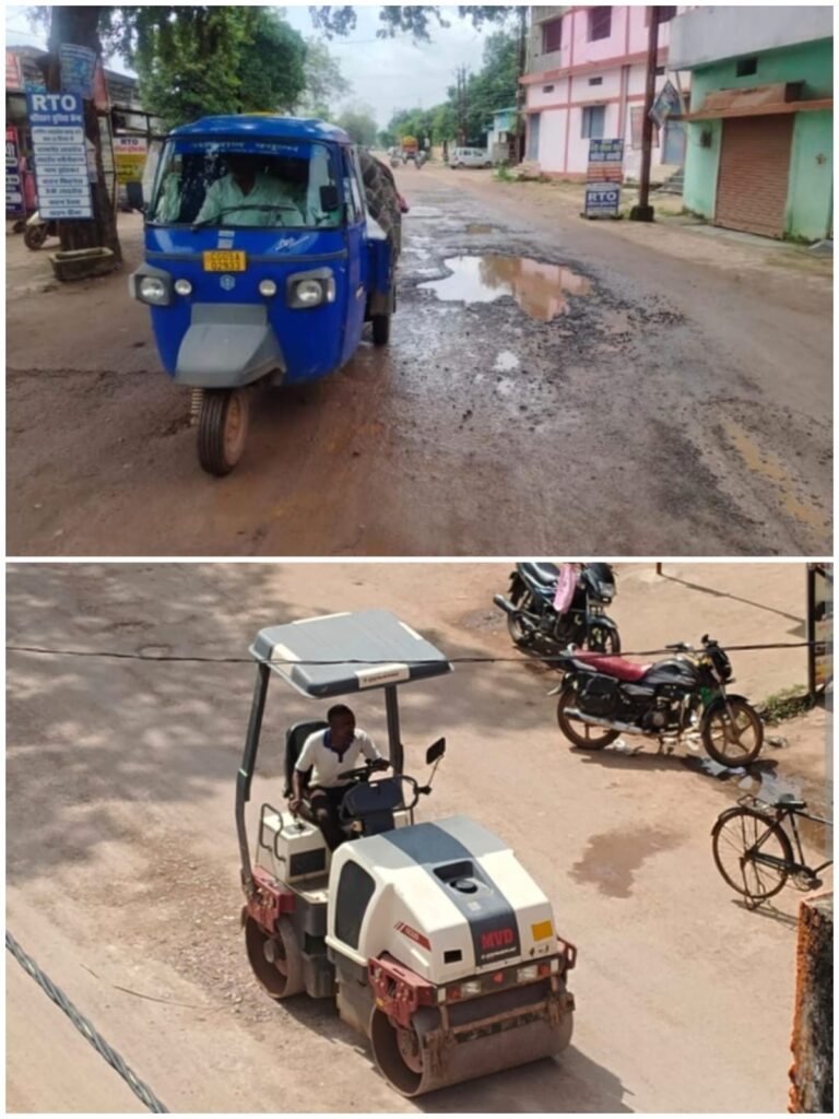 1 नवंबर से परेड ग्राउंड और गर्वमेन्ट बालक स्कूल में राज्योत्सव की तैयारियां जोरों पर हैं। इसी आयोजन को सुचारु दिखाने के लिए प्रशासन अब जर्जर सड़कों की मरम्मत का दिखावा कर रहा है। काम की गुणवत्ता का अंदाजा इसी से लगाया जा सकता है कि जिस सड़क की मरम्मत महीनों पहले होनी चाहिए थी, उसे अब सिर्फ ऊपर से पॉलिश किया जा रहा है। गड्ढों में मिट्टी डालकर रोलर चला देना क्या विकास कहलाता है या सिर्फ दिखावा।