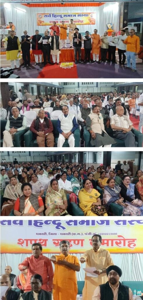 धमतरी । सर्व हिन्दू समाज संस्था का शनिवार को शपथ ग्रहण समारोह हुआ। नवनियुक्त अध्यक्ष महेश रोहरा, सचिव अशोक पवार, उपाध्यक्ष हरजिंदर सिंह छाबड़ा विजय गोलछा नंदू जसवानी बिसेसर पटेल दिलीप सोनी सुबोध राठी अजय जैन पवन अग्रवाल वरुण राय दिलीप पटेल सहित अन्य पदाधिकारियों ने शपथ लिया। शपथ ग्रहण के बाद विशिष्ट अतिथि डॉ रोशन उपाध्याय ने हिन्दुत्व व सनातन धर्म पर अपनी बात रखी।