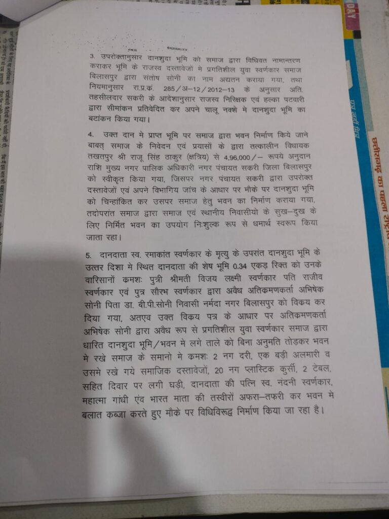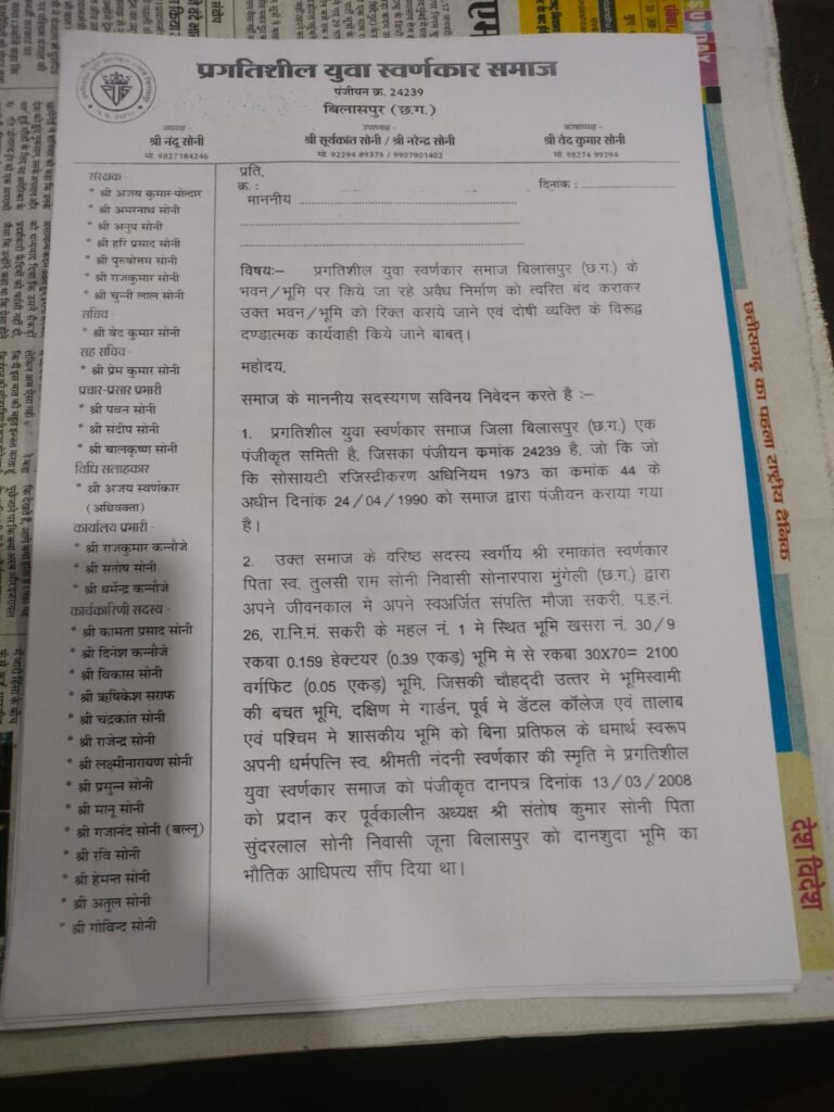 बिलासपुर (छत्तीसगढ़) । सकरी स्थित प्रगतिशील युवा स्वर्णकार समाज के सामुदायिक भवन पर कथित अवैध कब्जे को लेकर समाज में तीव्र आक्रोश व्याप्त है।