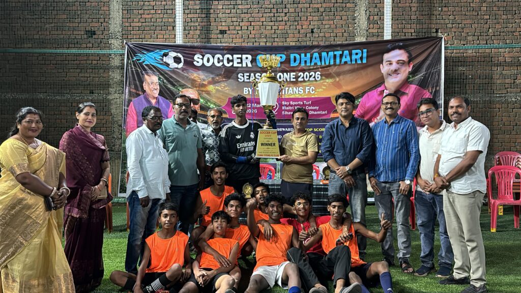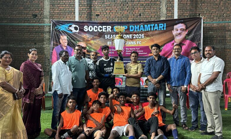धमतरी-: खेल पखवाड़ा के अंतर्गत प्रथम सोपान फुटबॉल मैच के रूप में संपन्न हुआ जिसमें शहर के दो प्रतिष्ठित फुटबाल टीम के बीच फाइनल खेला गया जिसमें टाउन फाइटर क्लब काफी कम कस के बाद इन्विंसिबल एफ सी क्लब की टीम को चार गोल से पराजित करते हुए सेंसर कप पर कब्जा रनिंग कप एवं 10000 रूपया की नगद राशि का इनाम जीता। वहीं दूसरे नंबर पर रही इन्विंसिबल एफसी टीम को7000 रूपया और रनिंग कप उपविजेता के रूप में प्रदान किया गया। समापन अवसर पर मुख्य अतिथि के रूप में उपस्थित धर्म प्रेमी समाज सेवी पंडित राजेश शर्मा ने कहा कि प्रतिभाओं को प्रोत्साहित एवं निखार करने के लिए सार्वजनिक जीवन में काम करने वाले सभी लोगों को आगे आना चाहिए यही वर्तमान समय की आवश्यकता है वहीं अध्यक्षता कर रहे हैं राजेंद्र शर्मा ने कहा कि शहर मे खेलों की पृष्ठभूमि काफी सशक्त एवं संपन्न है आवश्यकता है सहयोग की जिसके लिए समय-समय पर विभिन्न प्रकार का आयोजन पूर्व की तरह वर्तमान में भी करते हुए इसे आगे भी जारी रखना चाहिए। वहीं उपस्थित खिलाड़ियों को खेल पखवाड़ा के संयोजक योगेश रायचुरा तथा पार्षदगण पिन्टू यादव कुलेश सोनी ने भी संबोधित किया। उक्त आयोजन में विकास शर्मा, लक्की डागा, के साथ-साथ खिलाड़ियों में ऋषि, चिंटू, झम्मन,भौमिक, चंद्रकांत ,तेजस, रणवीर हिमांशु ,लव ,रूद्र , अरमान ,सागर ,आशीष शाहरुख भावेश ,सहित पालकों में श्रेया रायचुरा, ललिता नाडार,गीता पाण्डेय, लोकेश पाण्डेय,देवा नाडार उपस्थित रहे।